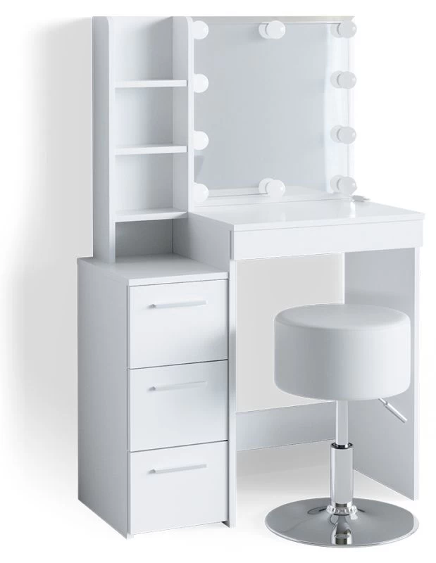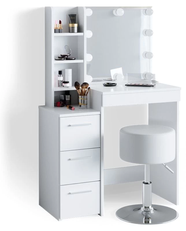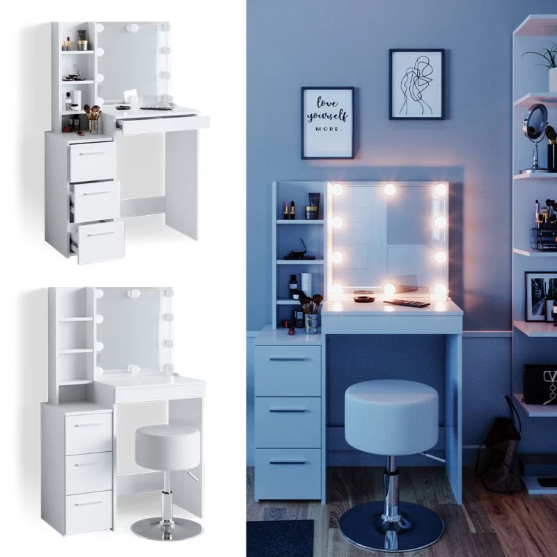 - Contenu de la livraison : • 1x coiffeuse • 1x tabouret design • 1x guirlande lumineuse Décoration non incluse